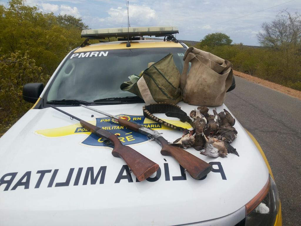 A Polícia de Trânsito flagra caçadores usando espingardas para abater codornizes e codornas na RN 117.